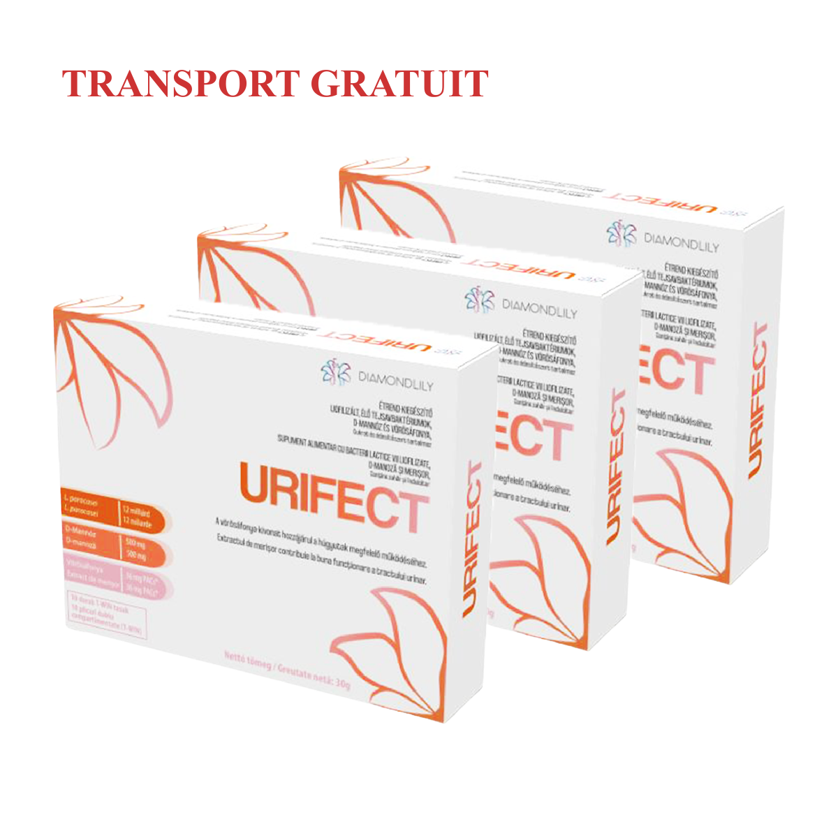 URIFECT este un supliment alimentar inovator, formulat pentru a contribui la prevenirea recurențelor infecțiilor de tract urinar (ITU). Conținând o combinație unică de D-manoză, extract de merișor la care se adauga și un probiotic specific uro-genital, cu 12 miliarde de Lactobacillus paracasei (LPC-S01), URIFECT contribuie la menținerea sănătății aparatului urinar, prevenind aderența bacteriilor patogene la peretele vezicii urinare și restabilind echilibrul microbiotei uro-genitale.