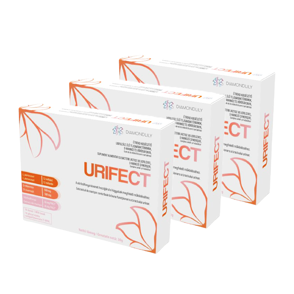 URIFECT este un supliment alimentar inovator, formulat pentru a contribui la prevenirea recurențelor infecțiilor de tract urinar (ITU). Conținând o combinație unică de D-manoză, extract de merișor la care se adauga și un probiotic specific uro-genital, Lactobacillus paracasei (LPC-S01), URIFECT contribuie la menținerea sănătății aparatului urinar, prevenind aderența bacteriilor patogene la peretele vezicii urinare și restabilind echilibrul microbiotei uro-genitale.